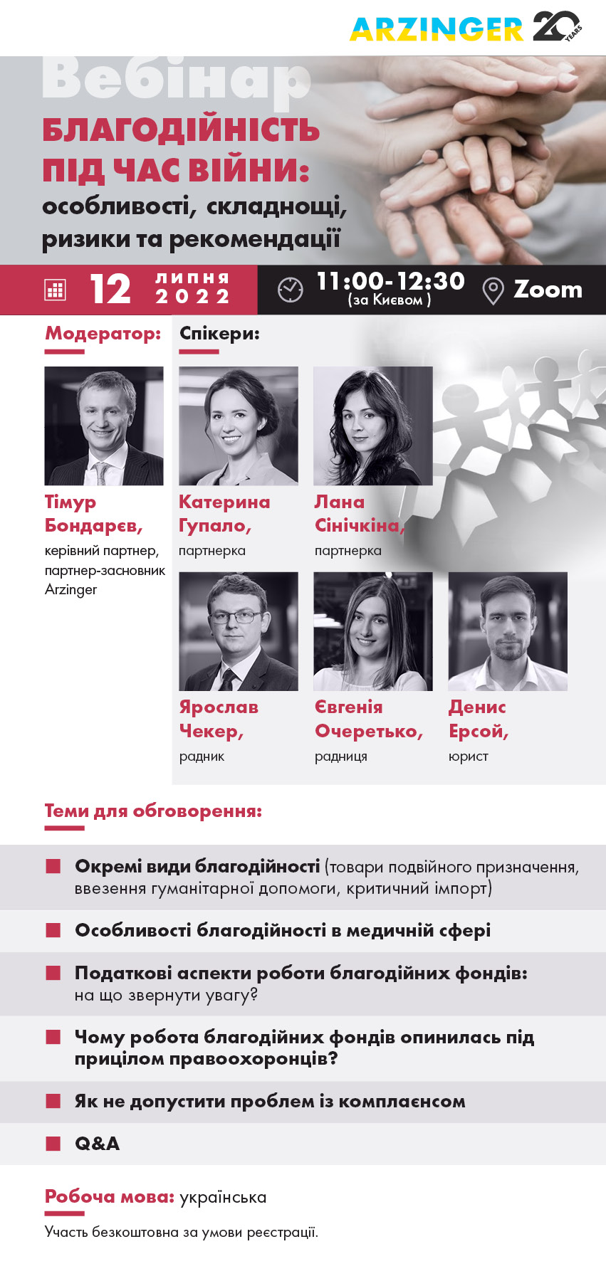 Запрошуємо взяти участь у вебінарі на тему „Благодійність під час війни: особливості, складнощі, ризики та рекомендації„, що відбудеться 12 липня 2022 року. Захід буде особливо актуальним для представників благодійних організацій.