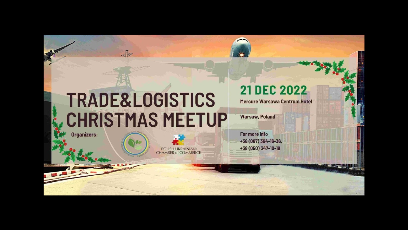 Stowarzyszenie Producentów i Konsumentów Roślin Strączkowych Ukrainy i Polsko – Ukraińska Izba Gospodarcza zapraszają do udziału w Trade&Logistics Christmas Meet Up Forum, które będzie miało miejsce 21 grudnia 2022 roku, w godzinach 13.00 – 21.00 w Mercure Warsaw Centrum Hotel w Warszawie, ul. Złota 48/54.