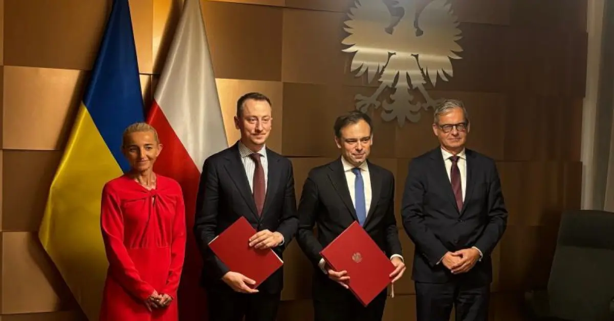 Na zdjęciu, po podpisaniu umowy, od lewej: pierwsza wiceprezes BGK prof. Marta Postuła, minister gospodarki Ukrainy Oleksii Sobolev, minister finansów i gospodarki Andrzej Domański, prezes BGK Mirosław Czekaj.